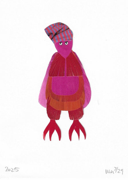 Distinctive cut paper collage mounted on white cardstock. Each piece is secured with a small square of card at the back, enabling easy transfer to any frame size. Available in a clear glassine with cardboard backing